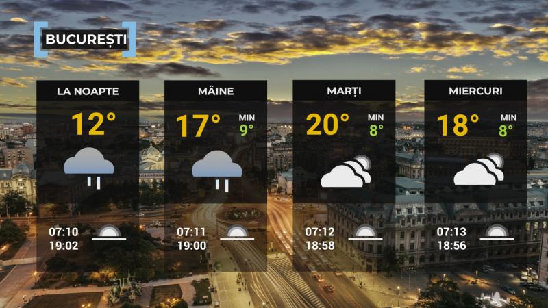 La noapte, cerul va fi mai mult noros şi temporar va ploua slab. Vântul va sufla slab pânã la moderat. Temperatura minimã va fi de 10...12 grade.