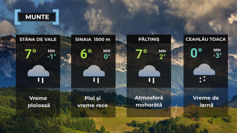 Cerul va avea înnorãri şi temporar va ploua. Pe alocuri se vor acumula cantitãţi de apã de 10...15 l/mp, iar la altitudini în general de peste 1800 m vor predomina ninsorile. Vântul va sufla slab şi moderat. Valorile termice vor scãdea.