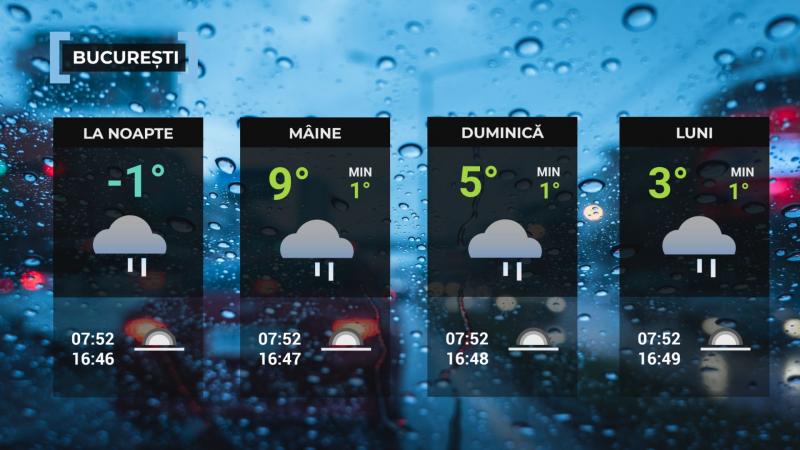 Valorile termice vor fi în creştere în sud-estul ţãrii, în centrul şi nord-estul teritoriului se va rãci, iar în rest nu vor fi variaţii semnificative faţã de ziua precedentã. Cerul va avea înnorãri şi temporar vor fi precipitaţii în majoritatea regiunilor, iar în sud-vest vor fi cantitãţi de apã de 10...20 l/mp şi pe arii restrânse de peste 20...25 l/mp. Precipitaţiile vor fi în special sub formã de ploaie în Dobrogea, mixte în Banat, Oltenia, Muntenia şi local în Crişana şi Moldova, iar în Maramureş, Transilvania, la deal şi la munte vor fi mai ales ninsori. Se va depune strat de zãpadã, cu grosimi în general de 5...15 cm, în zonele montane şi deluroase şi local în Transilvania, iar noaptea şi în Oltenia şi nord-vestul Munteniei. Pe alocuri va fi polei. Vântul va sufla slab şi moderat, cu intensificãri pe litoral şi pe crestele montane, cu viteze de 50...70 km/h, iar la altitudini de peste 1700 m în Carpaţii Orientali rafalele vor atinge 70...85 km/h, temporar ninsoarea va fi viscolitã şi vizibilitatea redusã. Temperaturile maxime se vor încadra în general între 0 şi 13 grade, cu cele mai mari valori în sud-estul teritoriului, iar cele minime vor fi cuprinse între -12 grade în estul Transilvaniei şi 4 grade pe litoral. Izolat se va forma ceaţã. Presiunea atmosferică va fi în creştere treptatã, dar se va menţine câmp ciclonic.