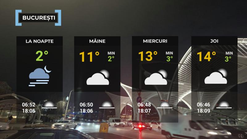 În București, vremea va fi în general frumoasă, iar valorile termice se vor situa peste mediile multianuale specifice datei. Cerul va fi variabil, iar în primele ore ale intervalului și din nou în a doua parte a nopții probabilitatea de apariție a norilor joși stratiformi și/sau a ceții va fi ridicată. Vântul va sufla în general slab. Temperatura maximă se va situa în jurul valorii de 11 grade, iar cea minimă va fi cuprinsă între -1 și 2 grade.