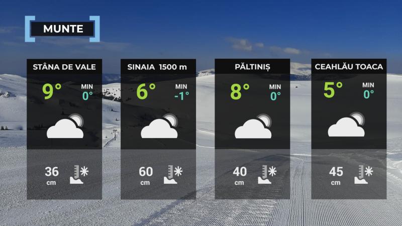 La munte,vremea se menţine în general frumoasă, cu temperaturi peste normalul perioadei. Cerul va fi variabil, cu înnorări temporare în zona Carpaţilor Meridionali şi a Carpaţilor de Curbură, însă sunt posibile ploi slabe izolat. Vântul va sufla slab şi moderat, însă în zona Carpaţilor Meridionali şi de Curbură vor fi intensificări, cu rafale care pot atinge 55-65 km/h.