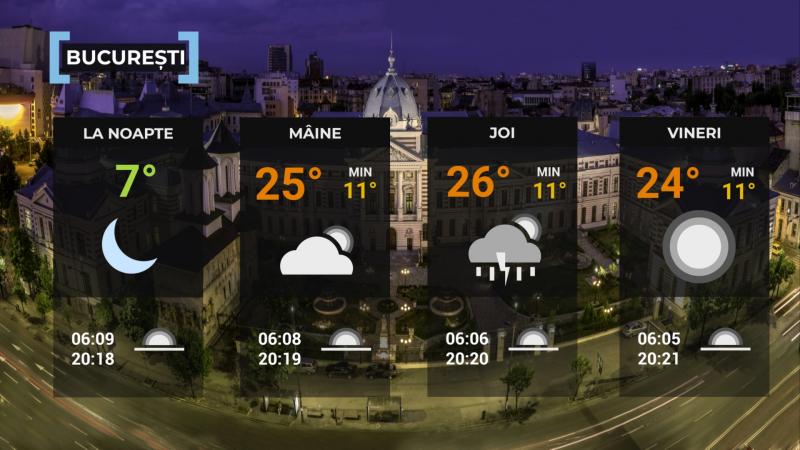 La noapte, cerul va fi variabil în regiunile nordice şi mai mult senin în restul zonelor. Vântul va sufla slab şi moderat. Temperaturile minime, în general mai mari decât în noaptea precedentã, vor fi cuprinse între 3 şi 12 grade, mai coborâte în depresiunile din estul Transilvaniei spre 0 grade, unde vor fi condiţii de brumã. Izolat vor fi condiţii de ceaţã.