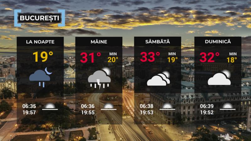 La noapte, cerul va fi temporar noros şi mai ales la începutul nopţii vor fi posibile averse. Vântul va sufla slab pânã la moderat. Temperatura minimã se va situa în jurul valorii de 19 grade.