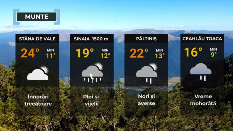 Cerul va fi variabil, cu înnorãri temporar accentuate mai ales dupã-amiaza şi seara, când vor fi averse, descãrcãri electrice şi trecãtor intensificãri ale vântului, în general cu viteze de 35...45 km/h. Temperatura maximã va fi de 30...31 de grade, iar cea minimã de 18...20 de grade. Presiunea atmosferică va fi uşor variabilã, la valori relativ coborâte.