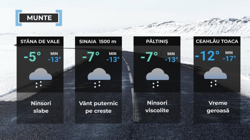 Cerul va fi variabil în sud și sud-est, și temporar noros în restul teritoriului. Va ninge slab la munte, în Maramureș, Transilvania, local în Moldova, Crișana și izolat în Oltenia, Muntenia și Dobrogea. În Banat vor fi precipitații slabe, predominant sub formă de lapoviță și ninsoare, cu posibile depuneri de polei. În vestul și sudul Olteniei, precum și în sud-vestul Munteniei, vântul va sufla cu intensificări, atingând viteze de 50-70 km/h. Temperaturile maxime se vor încadra, în general, între -4 și 5 grade, iar cele minime între -12 și -4 grade.
