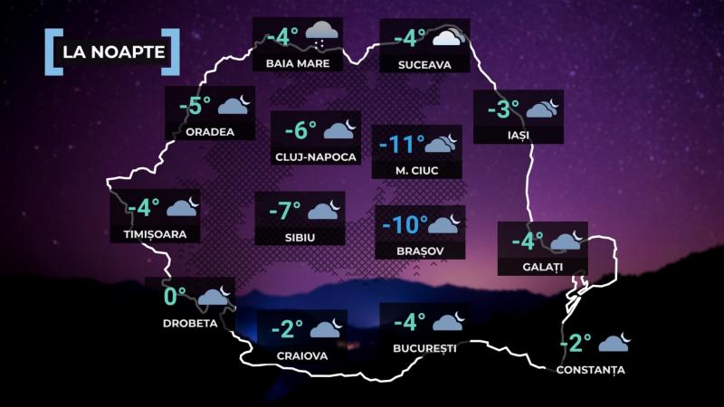Cerul se va înnora treptat în vestul, nordul și centrul țării, însă va rămâne variabil în celelalte regiuni. Va ninge slab în Maramureș, în Munții Apuseni, în Carpații Orientali, precum și în nordul Transilvaniei și al Moldovei. În Carpații Meridionali și de Curbură se vor semnala intensificări ale vântului, iar la altitudini de peste 1.700 m, rafalele vor atinge 90-120 km/h, viscolind zăpada depusă și menținând vizibilitatea redusă. Intensificări ale vântului se vor înregistra, izolat, și în restul țării, mai ales în nordul Moldovei, vestul și sudul Olteniei. Temperaturile minime se vor situa, în general, între -11 și -1 grad. Izolat se va semnala ceață.