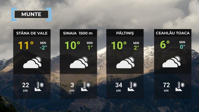 La noapte, cerul va fi mai mult noros în vestul, sud-vestul şi centrul ţãrii şi variabil în rest. Va ploua slab, local în Banat şi Oltenia şi pe arii restrânse în Crişana, Transilvania şi vestul Munteniei. În Munţii Apuseni, în Carpaţii Meridionali şi cu totul izolat în restul zonei montane, la altitudini de peste 1500 m, vor fi precipitaţii mixte. Vântul va sufla slab şi moderat, cu uşoare intensificãri pe crestele montane. Temperaturile minime vor fi cuprinse între -2 şi 8 grade, cu valori mai scãzute în depresiunile Carpaţilor Orientali pânã spre -5 grade. Se va forma ceaţã, local în centrul şi estul teritoriului şi izolat în rest.