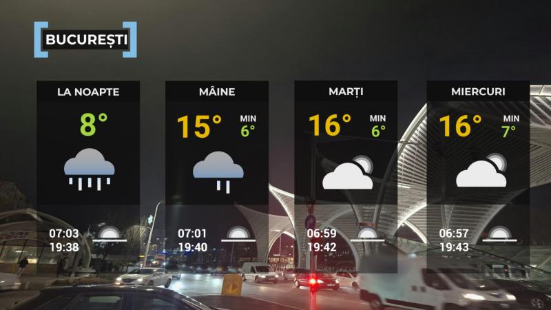 Cerul va avea înnorări și temporar va ploua pe arii extinse în vestul țării, local în centru și pe areale mici în rest. Pe alocuri se vor acumula cantități de apă de 10...15 l/mp. La munte, la altitudini în general de peste 1700 m, precipitațiile vor fi sub formă de ninsoare. Vântul va sufla slab și moderat, local cu intensificări în prima parte a intervalului în Moldova, Dobrogea, nord-estul Munteniei, vestul Olteniei și sudul Banatului, cu viteze la rafală în general de 45...50 km/h. Temperaturile maxime se vor încadra între 8 și 17 grade, iar cele minime vor fi cuprinse între 2 și 8 grade. Pe suprafețe mici vor fi condiții de ceață.