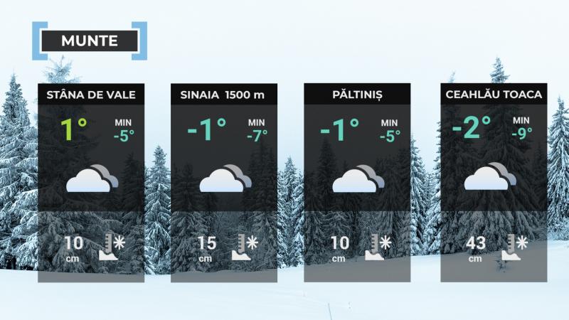 Regimul termic va fi caracterizat de valori normale pentru aceastã datã. Cerul va fi mai mult noros şi pe arii restrânse, trecãtor vor fi precipitaţii slabe. Acestea vor fi predominant sub formã de ploaie în Dobrogea, mixte în Muntenia şi Oltenia, iar la munte şi în zonele subcarpatice, precum şi în Moldova va ninge. Vântul va sufla slab şi moderat, cu uşoare intensificãri pe litoral. Temperaturile maxime se vor situa între 1 şi 8 grade, iar cele minime între -4 şi 5 grade, mai scãzute în depresiuni. Dimineaţa, pe arii restrânse va fi ceaţã. Presiunea atmosferică nu va avea variaţii semnificative.