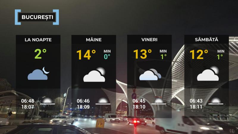 În Bucureşti, valorile termice vor fi peste cele specifice perioadei. Cerul va fi variabil, cu unele înnorări spre seară, când vor fi condiții ca trecător să plouă slab. Vântul va sufla slab și moderat. Temperatura maximă va fi de 13-14 grade, iar cea minimă de 1-3 grade. Dimineața și mai ales noaptea pot apărea condiții de ceață.