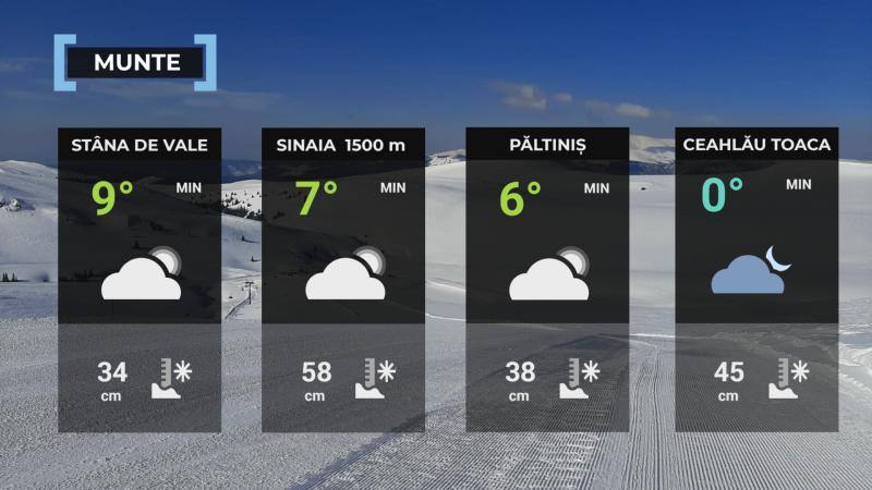 La munte, vremea va fi mai caldă decât în mod obișnuit pentru această perioadă. Cerul va fi variabil, cu înnorări temporare. Vântul va sufla slab și moderat, cu intensificări în zona montană înaltă, în special în Carpații Meridionali, unde rafalele pot ajunge la 60-70 km/h. Temperaturile maxime se vor încadra, în general, între 8 și 18 grade, iar cele minime între -8 și 4 grade. Dimineața și noaptea, pe arii restrânse, va fi ceață.