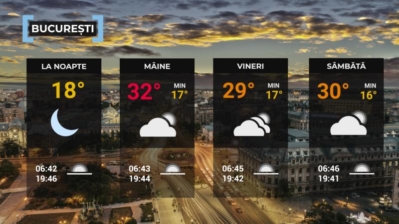 Valorile termice se vor situa în general peste mediile climatologice ale perioadei, astfel vremea va fi cãlduroasã în jumãtatea de sud-vest a ţãrii, local canicularã şi cu disconfort termic, mai ales în Banat. Temperaturile maxime se vor încadra între 26 şi 35 de grade, izolat mai scãzute în estul Transilvaniei, pe litoral şi în deltã. În Moldova, local în Dobrogea şi în zona Carpaţilor Orientali vor fi înnorãri temporar accentuate şi perioade cu averse ce vor avea şi caracter torenţial şi descãrcãri electrice. În intervale scurte de timp sau prin acumulare, izolat cantitãţile de apã vor fi însemnate (15...25 l/mp). În celelalte regiuni cerul va fi variabil, iar averse slabe vor fi posibile izolat, îndeosebi la munte - dupã-amiaza, iar spre sfârşitul nopţii - în Banat. Vântul va sufla slab şi moderat, temporar cu uşoare intensificãri, ziua, la munte, local în regiunile estice şi pe suprafeţe mici în rest. Minimele termice vor fi cuprinse între 12 şi 22 de grade, pe alocuri mai coborâte în nord şi în centru, cu precãdere în zonele depresionare, spre 7...9 grade. Presiunea atmosferică va fi usor variabilã.