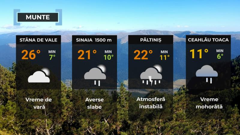 Cerul va fi variabil, cu înnorãri temporare şi perioade cu averse ce vor avea şi caracter torenţial, însoţite de descãrcãri electrice în Carpaţii Orientali. În intervale scurte de timp sau prin acumulare, izolat cantitãţile de apã vor fi însemnate (15...25 l/mp). În celelalte masive, averse slabe vor fi posibile izolat. Vântul va sufla slab şi moderat, temporar cu intensificãri uşoare ziua. Valorile termice vor fi comparabile cu cele din ziua precedentã.