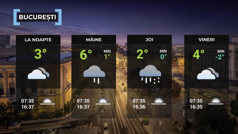 Vremea va fi în general închisã şi vor fi precipitaţii cea mai mare parte a ţãrii. Pe parcursul zilei, acestea vor fi predominant sub formã de ninsoare la munte, mixte în est şi mai ales ploi în rest, însã noaptea local se vor transforma în lapoviţã şi ninsoare în vestul, centrul şi sudul teritoriului. Izolat, cantitãţile de apã vor depãşi 10...15 l/mp şi vor fi condiţii de polei. Vântul va sufla slab şi moderat, cu uşoare intensificãri în zona montanã înaltã, în regiunile sudice şi sud-estice (rafale în general de 35...45 km/h). Temperaturile maxime se vor încadra între 1 şi 10 grade, iar cele minime între -4 şi 6 grade. Pe alocuri se va forma ceaţã. Presiunea atmosferică va fi usor variabilã în prima parte a intervalului, apoi va fi în creştere.