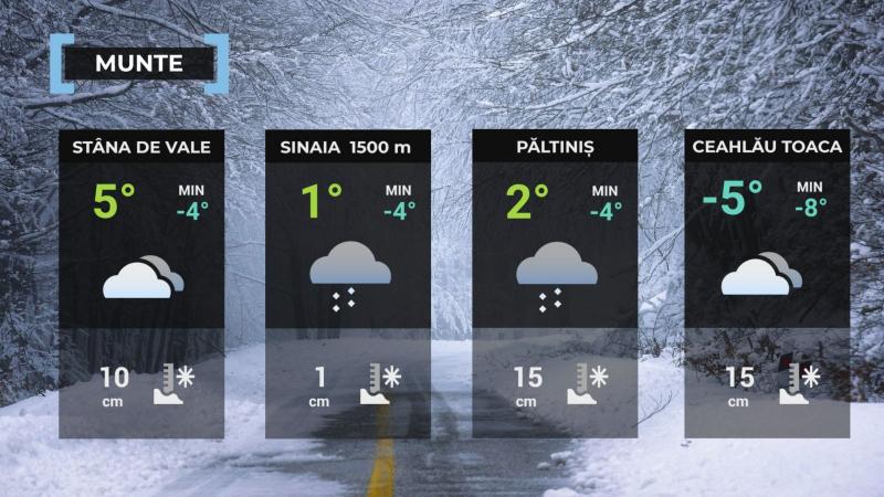 Vremea va fi în general închisã şi vor fi precipitaţii predominant sub formã de ninsoare. Izolat, cantitãţile de apã vor depãşi 10...15 l/mp şi vor fi condiţii de polei sau gheţuş. Vântul va sufla slab şi moderat, cu uşoare intensificãri în zona înaltã. Valorile termice nu vor avea variaţii semnificative faţã de intervalul precedent.