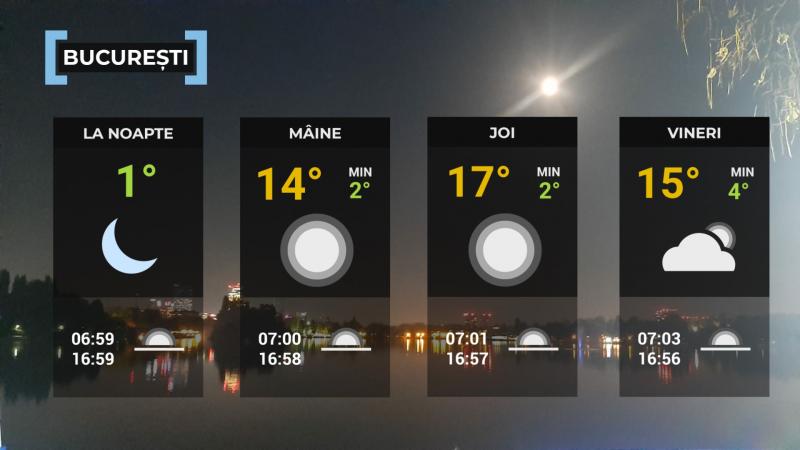 La noapte, cerul va fi mai mult senin, iar vântul va sufla slab pânã la moderat. Temperaturile minime, mai scãzute decât mediile climatologice specifice datei în majoritatea zonelor, vor fi cuprinse între -6 şi 5 grade, mai coborâte, pânã în jurul a -10 grade în depresiunile Carpaţilor Orientali. Izolat se va forma ceaţã.