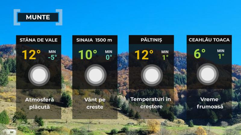 Vremea va fi predominant frumoasã, dar rece dimineaţa şi noaptea. Cerul va fi variabil în vestul ţãrii şi mai mult senin în rest, iar vântul va sufla slab pânã la moderat. Temperaturile maxime vor fi uşor mai ridicate faţã de ziua anterioarã, cu precãdere în jumãtatea de est a teritoriului, astfel încât se vor situa în jurul celor caracteristice datei şi se vor încadra între 9 şi 16 grade; minimele termice vor fi cuprinse între -10 grade în depresiunile Carpaţilor Orientali şi 7 grade în Dealurile de Vest. La începutul şi sfârşitul intervalului, pe arii restrânse, va fi ceaţã. Presiunea atmosferică va fi în creştere.