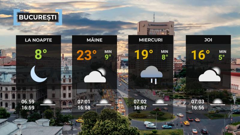 La noapte, cerul va fi mai mult senin, iar vântul va sufla slab pânã la moderat. Temperatura minimã va fi de 5...8 grade.