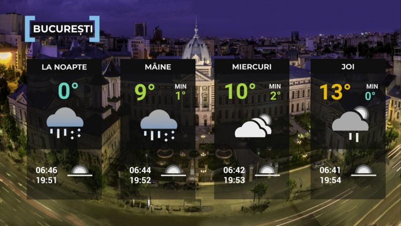 Valorile termice se vor situa sub cele specifice datei. Cerul va avea înnorãri temporare şi trecãtor vor fi precipitaţii slabe mixte (ploaie, lapoviţã şi ninsoare). Vântul va sufla slab şi moderat. Temperatura maximã se va situa în jurul a 9 grade, iar cea minimã va fi de -1...1 grad, mai coborâtã în zona preorãşeneascã, unde se va produce brumã. Presiunea atmosferică va fi în scãdere.