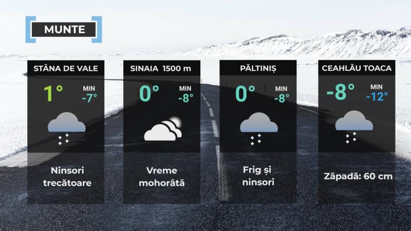 Vremea va fi deosebit de rece pentru aceastã perioadã. Cerul va fi temporar noros, vor fi precipitaţii sub formã de ninsoare şi se va depune strat de zãpadã în general de 5...10 cm. Vântul va sufla slab şi moderat, cu intensificãri temporare la altitudini mari, unde vor fi rafale de 70...80 km/h şi viscol.
