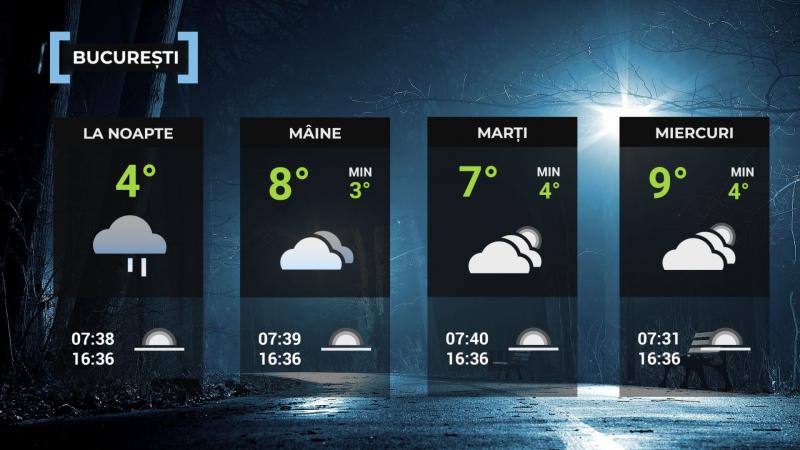La noapte, cerul va fi mai mult noros şi va ploua slab, local în Muntenia, Dobrogea, sudul Moldovei şi în Banat şi cu totul izolat în celelalte regiuni. În Carpaţii Meridionali şi în Carpaţii de Curburã, la altitudini de peste 1500 m, se vor semnala precipitaţii slabe mixte. Vântul va sufla slab şi moderat, temporar cu intensificãri pe litoral şi în zona Carpaţilor de Curburã, unde vor fi viteze în general de 40...50 km/h. Temperaturile minime se vor încadra între -1 şi 6 grade. Pe arii restrânse, îndeosebi în vest, sud-vest şi centru se va forma ceaţã, asociatã trecãtor cu burniţã.