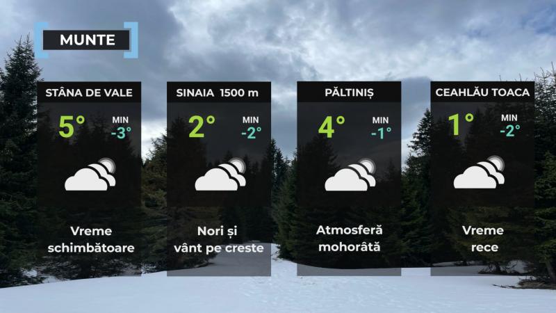Cerul va fi mai mult noros, iar vântul va sufla slab pânã la moderat. Temperatura maximã se va situa în jurul a 7 grade, iar cea minimã va fi de 2...3 grade. Noaptea vor fi condiţii de ceaţã.