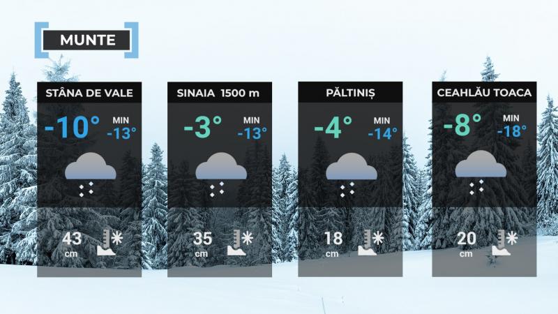 Cerul va fi mai mult noros și va ninge în zonele montane. În jumătatea nordică a țării și la munte se va depune un strat de zăpadă, în general de 3...10 cm. Vântul va sufla cu intensificări, în special pe crestele Carpaților Meridionali și de Curbură, unde rafalele vor depăși 80...90 km/h, viscolind ninsoarea și reducând vizibilitatea.