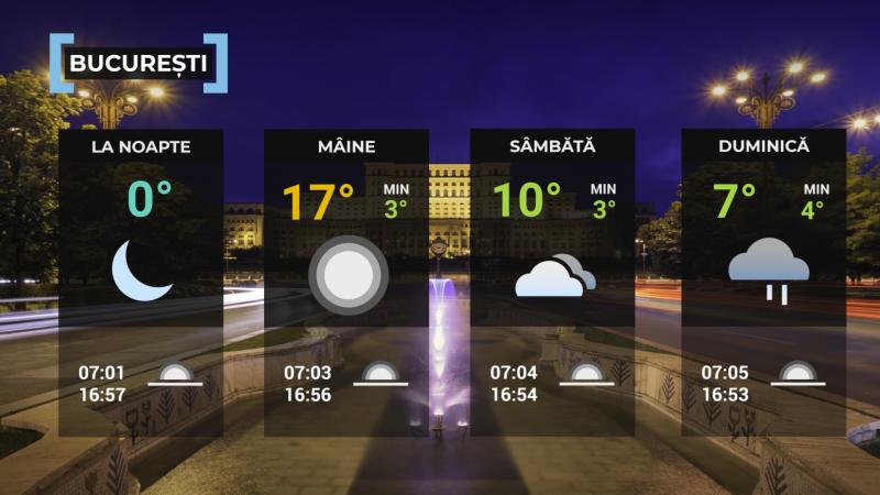 La noapte, vremea va fi rece. Cerul va fi senin, iar vântul va sufla slab. Temperatura minimã va fi de -1...0 grade, mai scãzutã în zona preorãşeneascã pânã spre valori în jurul a -4 grade.