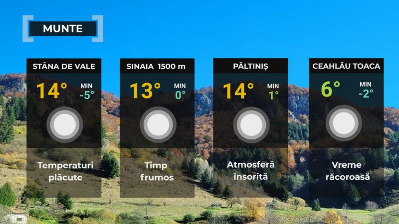Vremea va fi în continuare frumoasã, dar rece dimineaţa. Cerul va fi senin pe parcursul zilei şi la începutul nopţii, apoi se va înnora treptat. Vântul va sufla slab pânã la moderat. Temperatura maximã se va situa în jurul valorii de 16 grade, iar cea minimã va fi 2...3 grade, uşor mai scãzutã în zona preorãşeneascã. Presiunea atmosferică va fi usor variabilã.