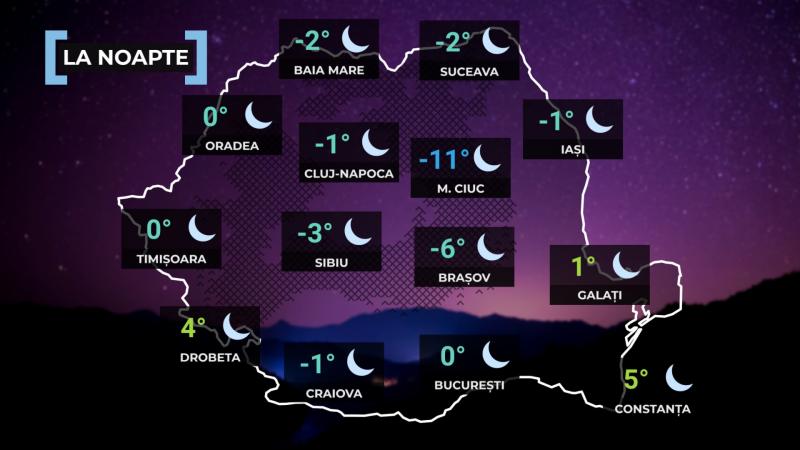 La noapte, vremea va fi rece. Cerul va fi mai mult senin, iar vântul va sufla slab pânã la moderat. Temperaturile minime vor fi cuprinse între -6 şi 8 grade, mai scãzute în depresiunile Carpaţilor Orientali, pânã spre valori în jurul a -11 grade. Izolat se va forma ceaţã.