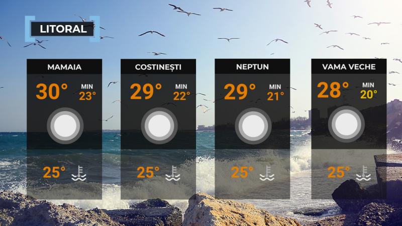 Valorile termice vor creşte, iar vremea va deveni cãlduroasã în cea mai mare parte a zonei. Cerul va fi mai mult senin, iar vântul va sufla slab şi moderat. Temperaturile maxime se vor încadra între 28 şi 32 de grade, iar cele minime se vor încadra între 20 şi 23 de grade. Temperatura apei mãrii va avea valori de 24...26 de grade.
