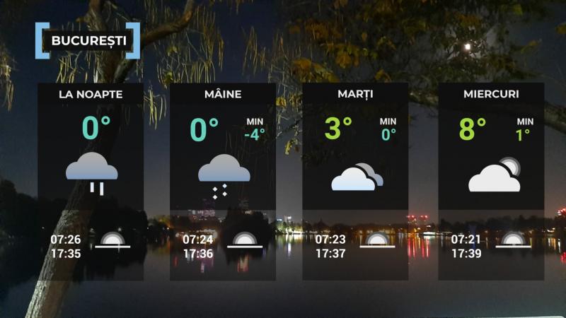 În București, vremea se va răci accentuat față de zilele precedente. Cerul va fi mai mult noros, iar în prima parte a zilei va ninge slab, trecător. Vântul va prezenta intensificări temporare, cu rafale de 40...45 km/h. Temperatura maximă va fi de -1...0 grade, iar cea minimă între -6 și -4 grade.