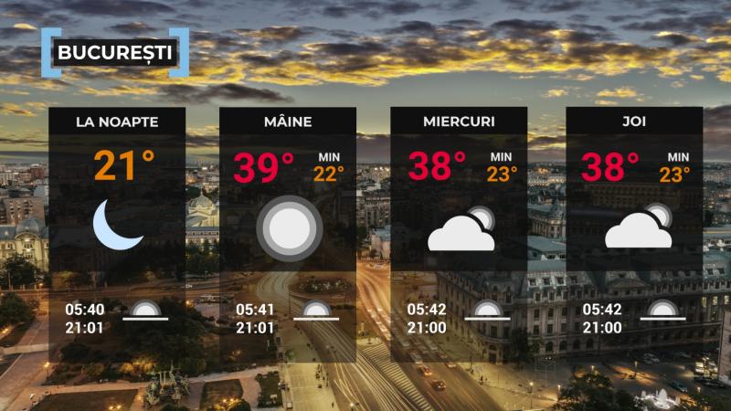 Vremea va fi cãlduroasã, iar disconfortul termic va fi ridicat, astfel cã, indicele temperaturã-umezealã (ITU), va atinge pragul critic de 80 de unitãţi. Cerul va fi mai mult senin, iar vântul va sufla slab şi moderat, în uşoarã intensificare dupã-amiaza. Temperaturile maxime se vor încadra între 31 şi 34 de grade, iar noaptea va fi tropicalã, cu minime cuprinse între 23 şi 26 de grade.