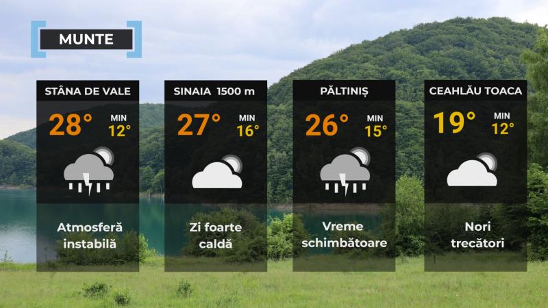 Vremea se va menţine caldã. Cerul va fi variabil, cu înnorãri temporare dupã-amiaza, când vor fi averse slabe, descãrcãri electrice şi uşoare intensificãri ale vântului, local în Carpaţii Occidentali şi Meridionali, precum şi în nordul Carpaţilor Orientali.