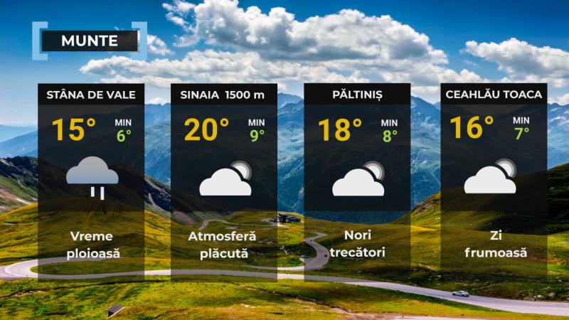 Vremea va fi caldã pentru aceastã datã. Cerul va fi variabil, temporar cu înnorãri, ziua în masivele cuprinse în jumãtatea vesticã a ţãrii, iar noaptea în cele estice. Pe arii restrânse din Carpaţii Occidentali şi Meridionali va ploua slab. Vântul va sufla slab şi moderat, cu unele intensificãri în zona montanã înaltã, în special în prima parte a intervalului.