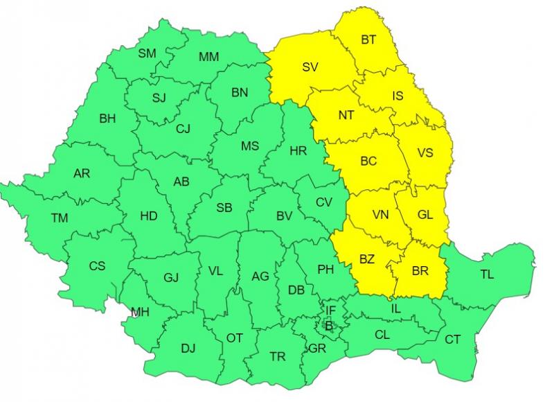 Harta județelor afectate de codul galben de vreme severă